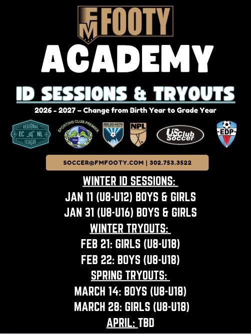 FMFooty Academy is excited to announce our 2026–2027 Winter ID Sessions and Spring Tryouts for boys and girls ages U8–U19.