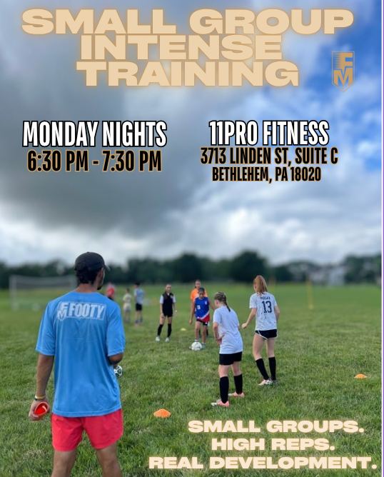 Our Monday night small group sessions deliver focused technical work and intense, game-relevant reps. No standing around — just constant movement, quality touches, and a pro-level training mentality.